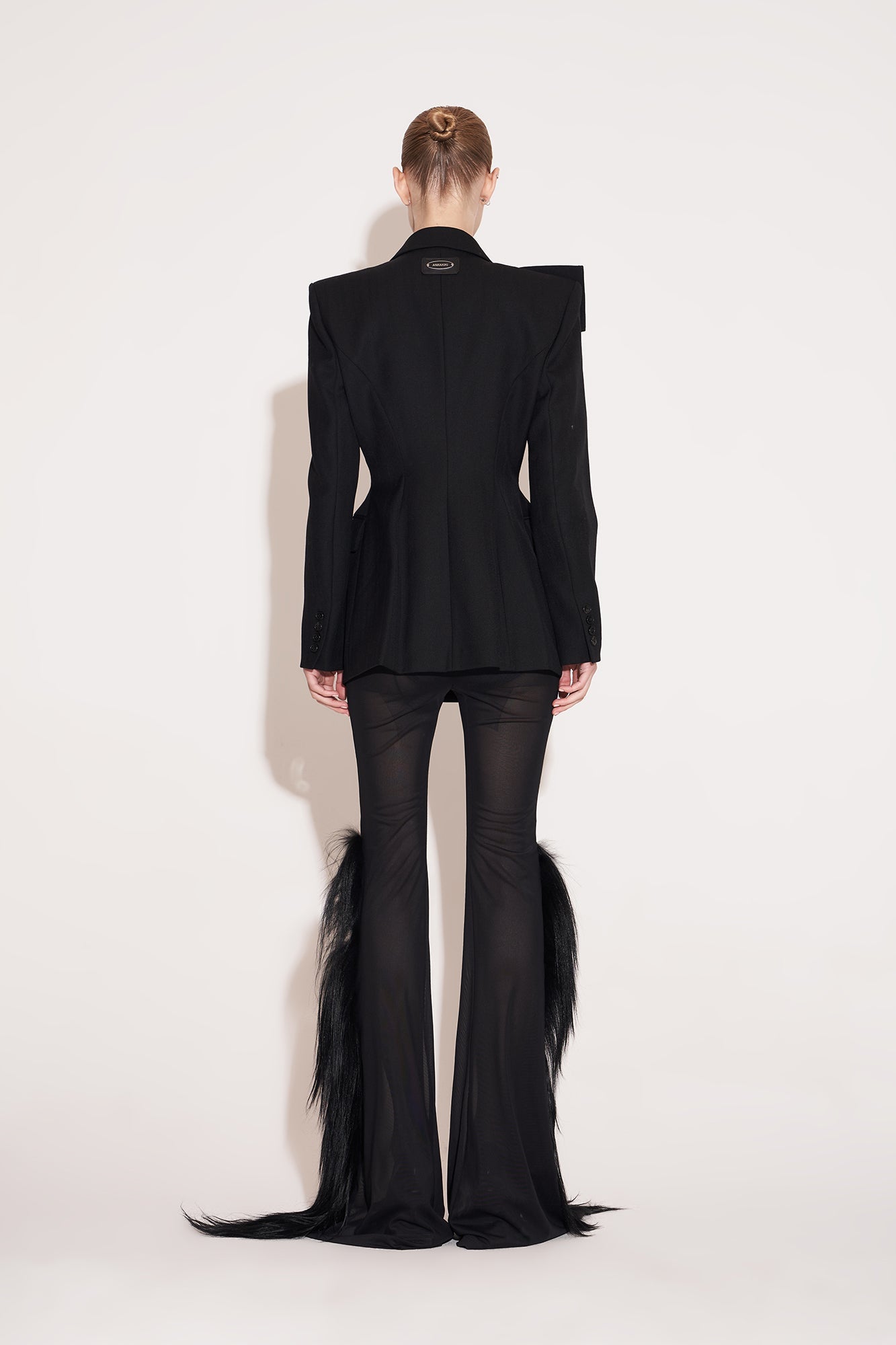 The gun lapel collar is integrated into the three-dimensional flying piece cutting, forming a sense of geometric layering, breaking the planarization of the traditional suit collar, adding architectural aesthetics and futuristic style, and achieving high visual recognition